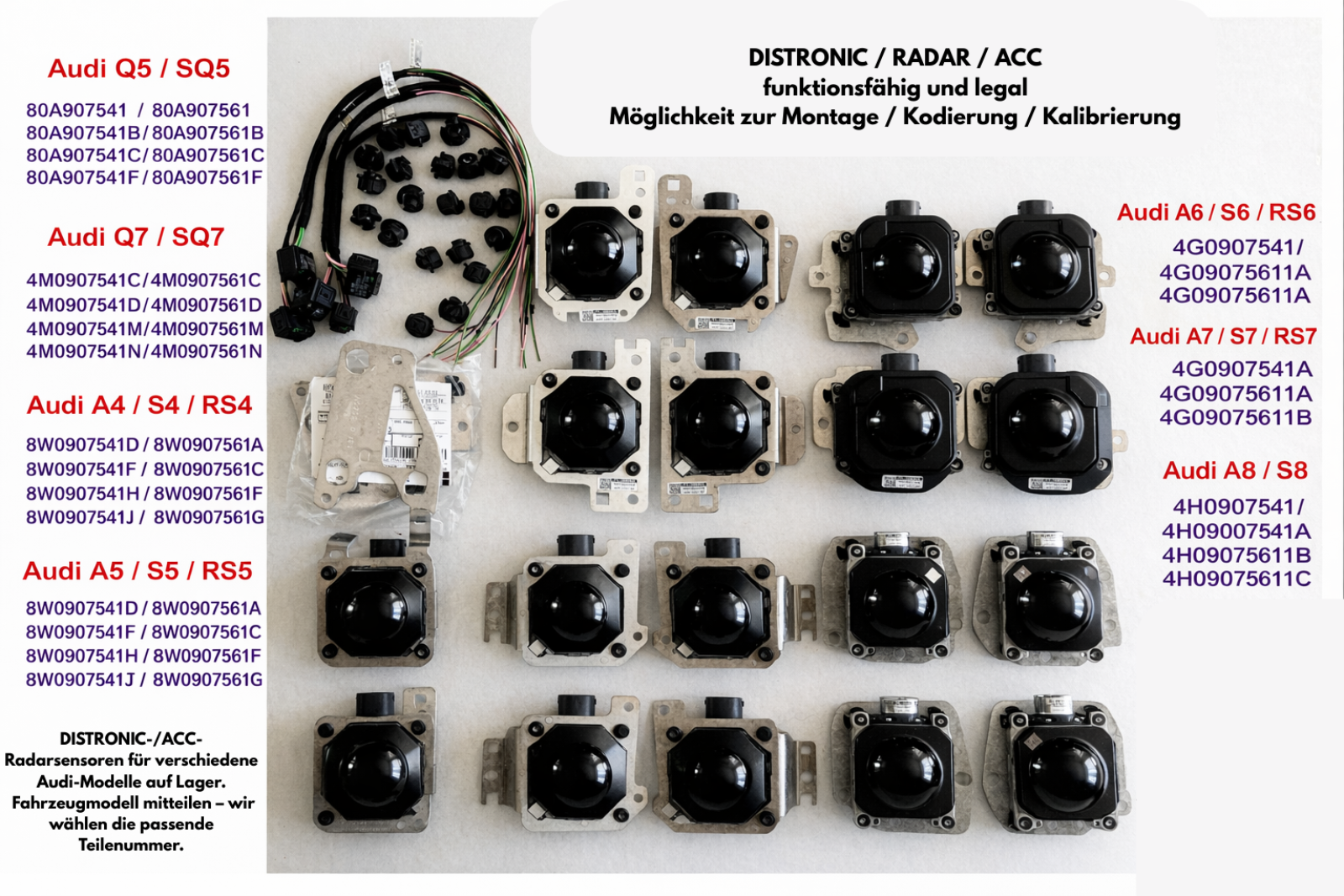Zum Verkauf steht ein originales ACC / Distronic Radar Set für Audi A6, S6, RS6 sowie A7, S7 und RS7. Das Set besteht aus zwei Sensoren – links (4G0907541B) und rechts (4G0907561B).